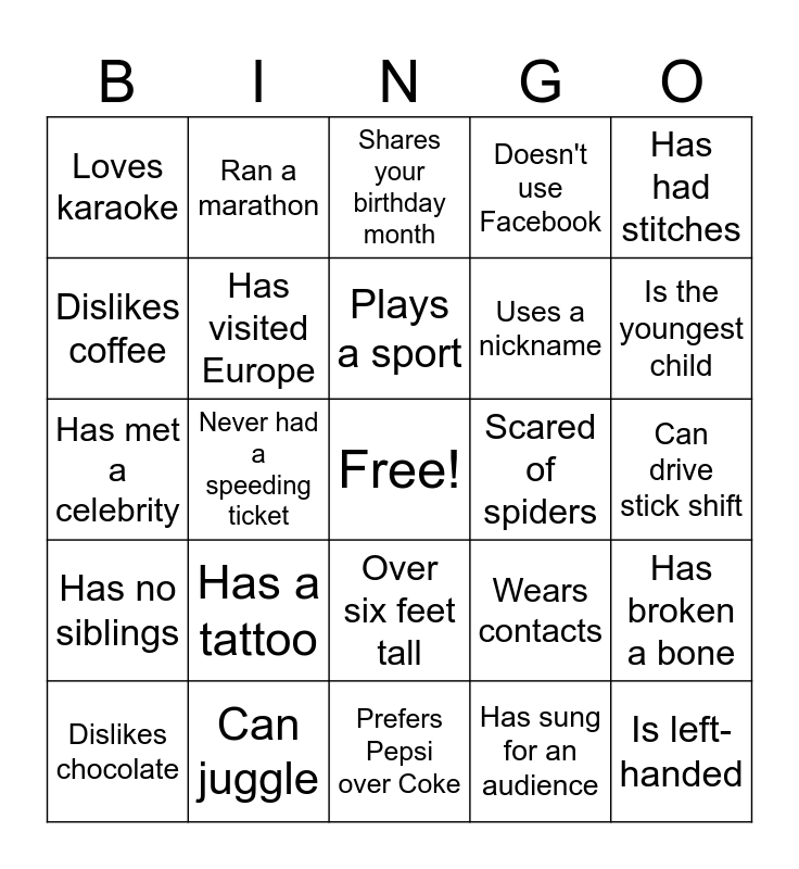 This bingo card has a free space and 24 words: Has a tattoo, Can juggle, Plays a sport, Dislikes chocolate, Has had stitches, Loves karaoke, Dislikes coffee, Ran a marathon, Scared of spiders, Over six feet tall, Uses a nickname, Has met a celebrity, Wears contacts, Has broken a bone, Has visited Europe, Has sung for an audience, Can drive stick shift, Shares your birthday month, Is the youngest child, Never had a speeding ticket, Is left-handed, Has no siblings, Doesn't use Facebook and Prefers Pepsi over Coke.