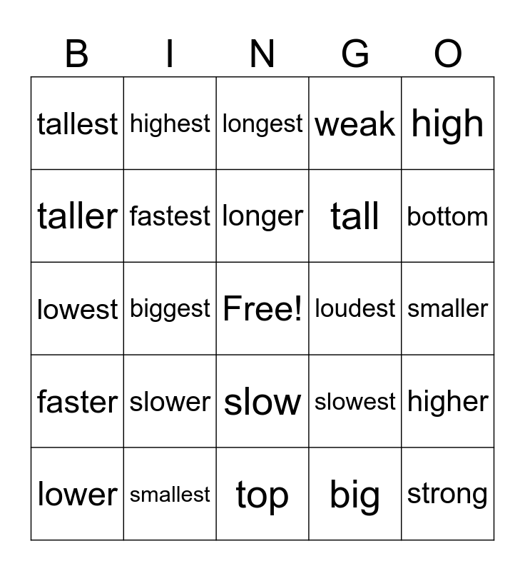 This bingo card has a free space and 32 words: big, bigger, biggest, fast, faster, fastest, high, higher, highest, long, longer, longest, loud, louder, loudest, low, lower, lowest, slow, slower, slowest, small, smaller, smallest, strong, weak, tall, taller, tallest, top, middle and bottom.