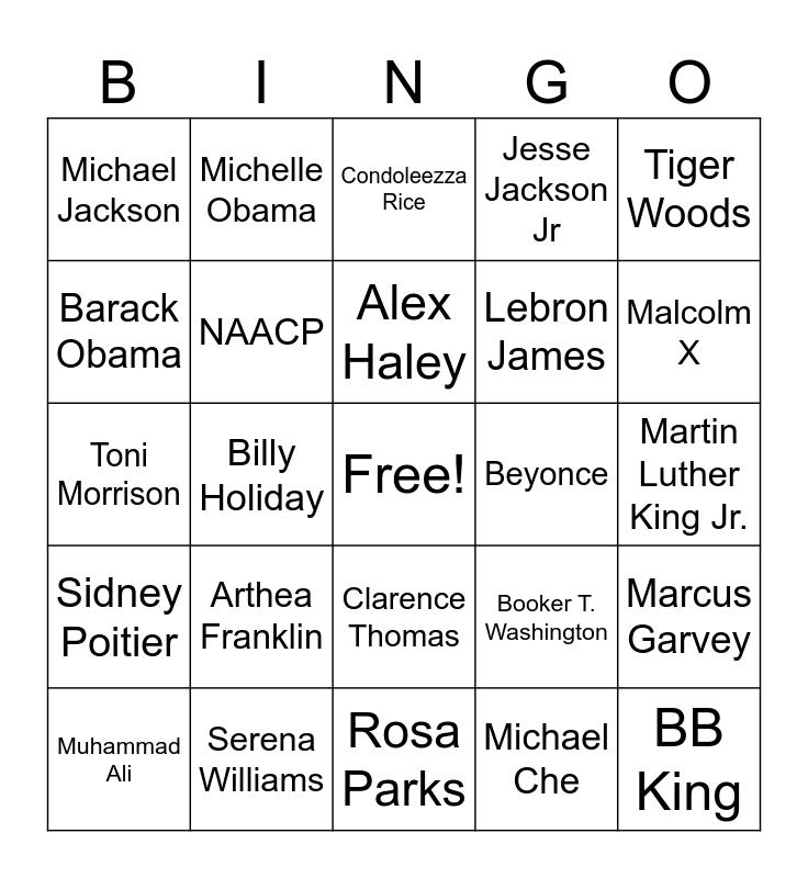 This bingo card has a free space and 37 words: Marion Anderson, Maya Angelou, WEB DuBois, NAACP, Marcus Garvey, Arthea Franklin, Alex Haley, Hattie McDaniel, Tiger Woods, Vanessa Williams, Billy Holiday, Jesse Jackson Jr, BB King, Martin Luther King Jr., Barack Obama, Sidney Poitier, Colin Powell, Condoleezza Rice, Clarence Thomas, Beyonce, Michael Jackson, Malcolm X, Muhammad Ali, Rosa Parks, Jackie Robinson, Michael Che, Michelle Obama, Thurgood Marshall, Ella Fitzgerald, Denzel Washington, James Earl Jones, Serena Williams, Toni Morrison, Harriet Tubman, Booker T. Washington, Lebron James and Oprah Winfrey.