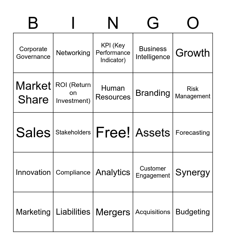 This bingo card has a free space and 29 words: Marketing, Revenue, Stakeholders, Leadership, Corporate Governance, KPI (Key Performance Indicator), ROI (Return on Investment), Compliance, Assets, Liabilities, Forecasting, Budgeting, Mergers, Acquisitions, Risk Management, Supply Chain, Analytics, Innovation, Growth, Sales, Customer Engagement, Product Development, Branding, Market Share, Business Intelligence, Networking, Synergy, Human Resources and Talent Acquisition.