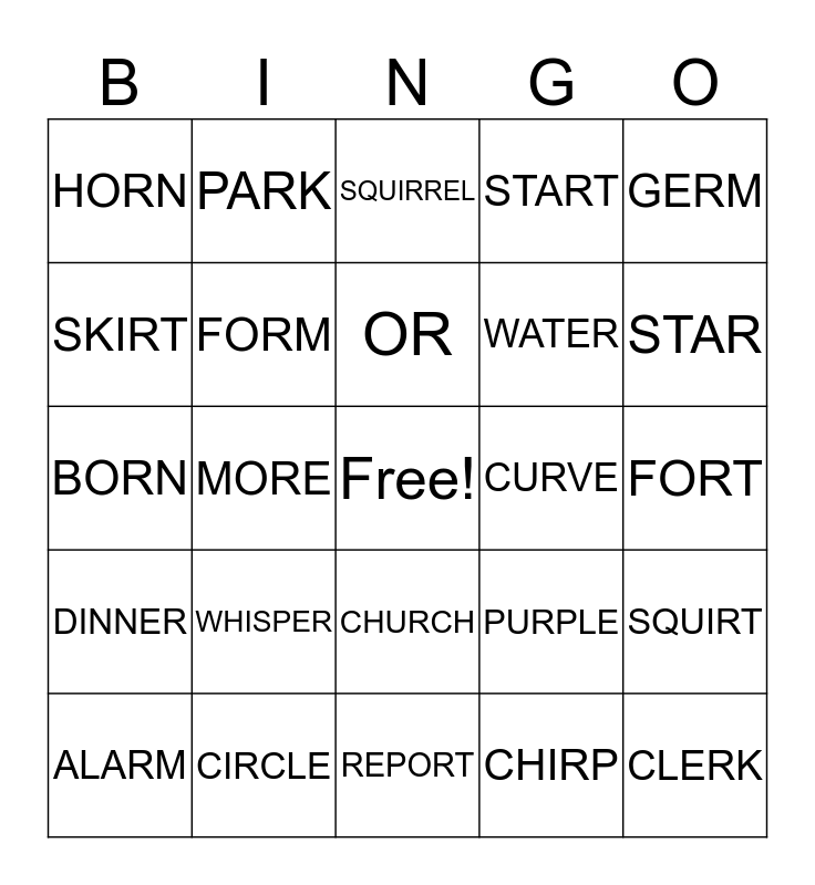 This bingo card has a free space and 39 words: CAR, CHORE, PAPER, FORM, ALARM, CHURCH, OR, FIRST, GERM, DINNER, MORE, START, CLERK, FORT, CURVE, WHISPER, THIRD, HORN, FART, PURPLE, SKIRT, REPORT, WATER, STAR, TIGER, TEACHER, SIR, BAR, SIR, PARK, SHIRT, SWERVE, SQUIRREL, CIRCLE, CHIRP, BIRTHDAY, SQUIRT, BORN and HAIR.