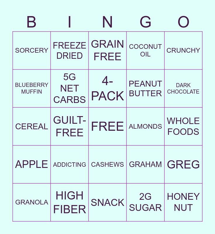This bingo card has a free space and 43 words: MIXED BERRY, HONEY NUT, COCOA, GRANOLA, HIGH PROTEIN, 2G SUGAR, GRAIN FREE, GLUTEN FREE, CRUNCHY, HIGH FIBER, COCONUT OIL, ALMONDS, CASHEWS, ADDICTING, DELICIOUS, SNACK, BREAKFAST, CEREAL, FROSTED, DARK CHOCOLATE, FREEZE DRIED, VARIETY PACK, KETO-FRIENDLY, SORCERY, BUNDLES, WHOLE FOODS, TARGET, HONEY, GRAHAM, APPLE, CINNAMON, GREG, GABI, GUILT-FREE, TREAT, MARSHMALLOW, 6-PACK, 4-PACK, BLUEBERRY MUFFIN, PEANUT BUTTER, NATURAL FLAVORS, 5G NET CARBS and HAPPINESS.
