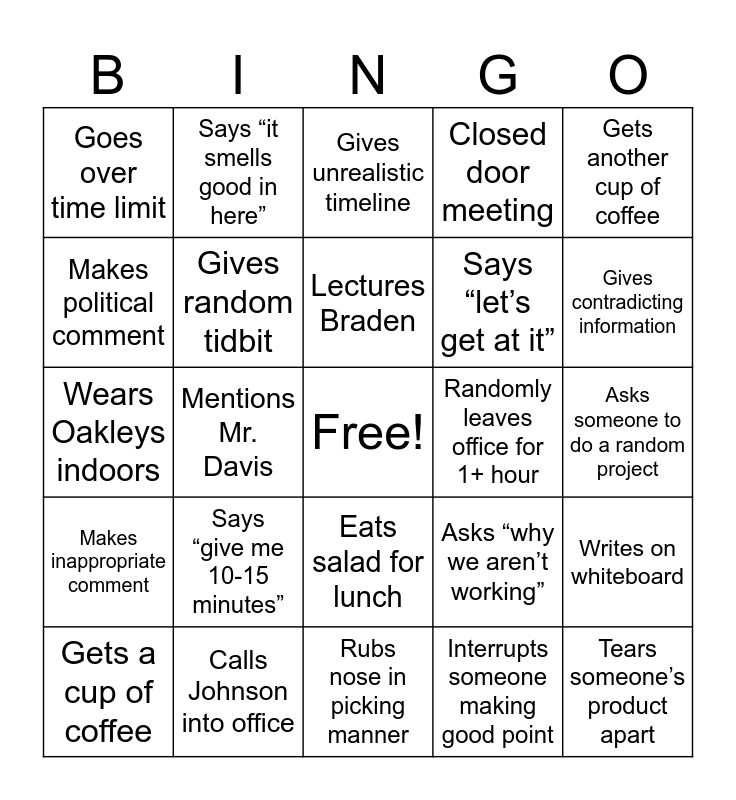 This bingo card has a free space and 24 words: Says “give me 10-15 minutes”, Calls Johnson into office, Lectures Braden, Gets a cup of coffee, Gets another cup of coffee, Goes over time limit, Makes political comment, Says “it smells good in here”, Randomly leaves office for 1+ hour, Eats salad for lunch, Says “let’s get at it”, Wears Oakleys indoors, Asks “why we aren’t working”, Writes on whiteboard, Gives random tidbit, Interrupts someone making good point, Asks someone to do a random project, Gives unrealistic timeline, Gives contradicting information, Mentions Mr. Davis, Tears someone’s product apart, Makes inappropriate comment, Closed door meeting and Rubs nose in picking manner.