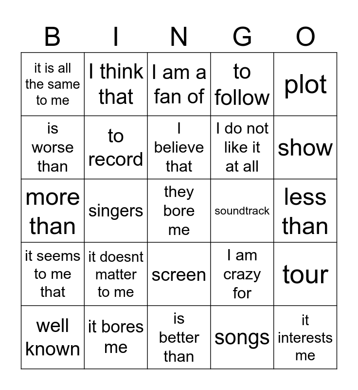 This bingo card has 25 words: it doesnt matter to me, is better than, I believe that, well known, plot, it is all the same to me, is worse than, I think that, soundtrack, screen, I do not like it at all, more than, I am crazy for, tour, to record, it interests me, less than, I am a fan of, show, singers, they bore me, it bores me, it seems to me that, to follow and songs.