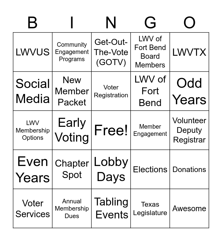 This bingo card has a free space and 24 words: Chapter Spot, Annual Membership Dues, Voter Registration, Voter Services, LWVTX, LWVUS, Social Media, Community Engagement Programs, Member Engagement, Lobby Days, LWV of Fort Bend, LWV Membership Options, Elections, Donations, New Member Packet, Texas Legislature, Volunteer Deputy Registrar, Get-Out-The-Vote (GOTV), Odd Years, Early Voting, Awesome, Even Years, LWV of Fort Bend Board Members and Tabling Events.