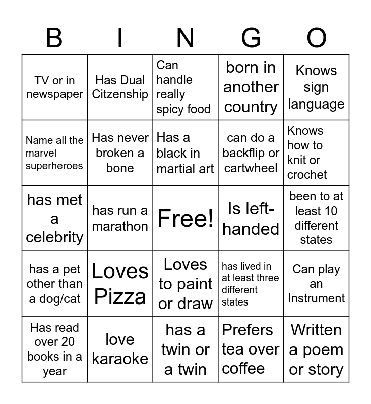 This bingo card has a free space and 24 words: Loves Pizza, love karaoke, Has a black in martial art, Has read over 20 books in a year, Knows sign language, TV or in newspaper, Name all the marvel superheroes, Has Dual Citzenship, Is left- handed, Loves to paint or draw, can do a backflip or cartwheel, has met a celebrity, has lived in at least three different states, Can play an Instrument, Has never broken a bone, Prefers tea over coffee, been to at least 10 different states, Can handle really spicy food, Knows how to knit or crochet, has run a marathon, Written a poem or story, has a pet other than a dog/cat, born in another country and has a twin or a twin.