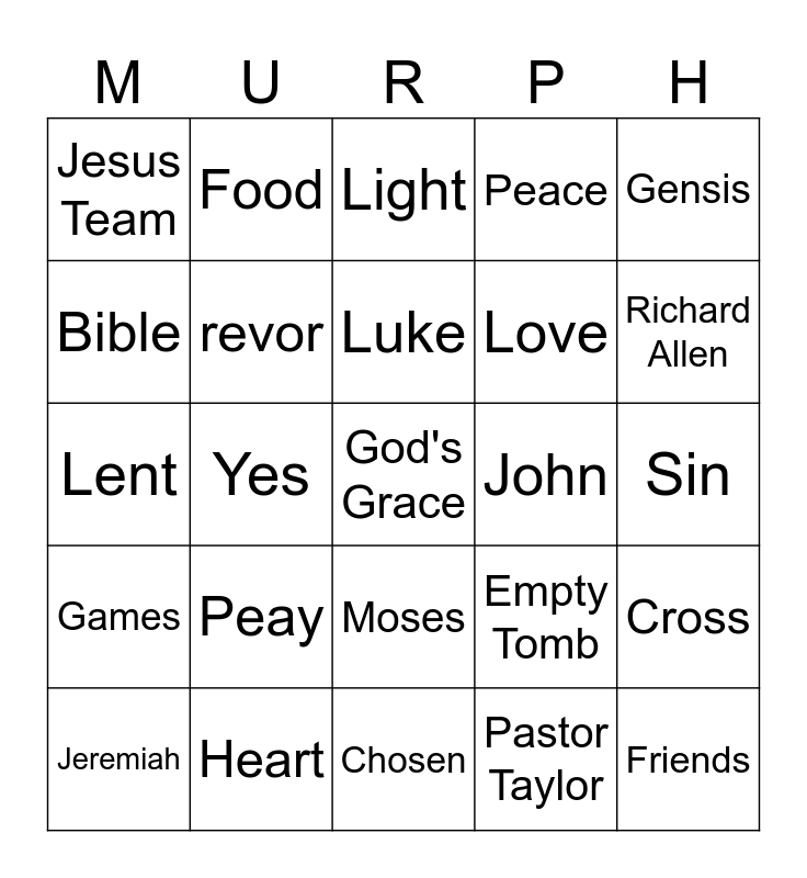 This bingo card has a free space and 47 words: Jesus, Friends, Tanner, Chosen, Peay, Movies, Food, Lock-in, Bible, Hope, revor, Peace, Cross, Empty Tomb, Matthew, Mark, Luke, John, Exodus, Gensis, Yes, Pastor Taylor, Jesus Team, Love, Ruth, Richard Allen, Jeremiah, Games, Moses, Games, Sleep, Lord's Prayer, Temptation, Peace, Palm Sunday, Heart, Sin, Obedience, Romans, David, Good News, Light, Lent, Victory, Holy Trinity, Follow and Lost Shrrp.