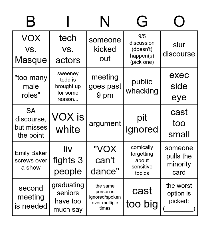 This bingo card has a free space and 24 words: liv fights 3 people, graduating seniors have too much say, meeting goes past 9 pm, second meeting is needed, slur discourse, VOX vs. Masque, "too many male roles", tech vs. actors, pit ignored, "VOX can't dance", public whacking, SA discourse, but misses the point, comically forgetting about sensitive topics, someone pulls the minority card, sweeney todd is brought up for some reason..., cast too big, cast too small, someone kicked out, exec side eye, VOX is white, the worst option is picked: (________), Emily Baker screws over a show, 9/5 discussion (doesn't) happen(s) (pick one) and the same person is ignored/spoken over multiple times.