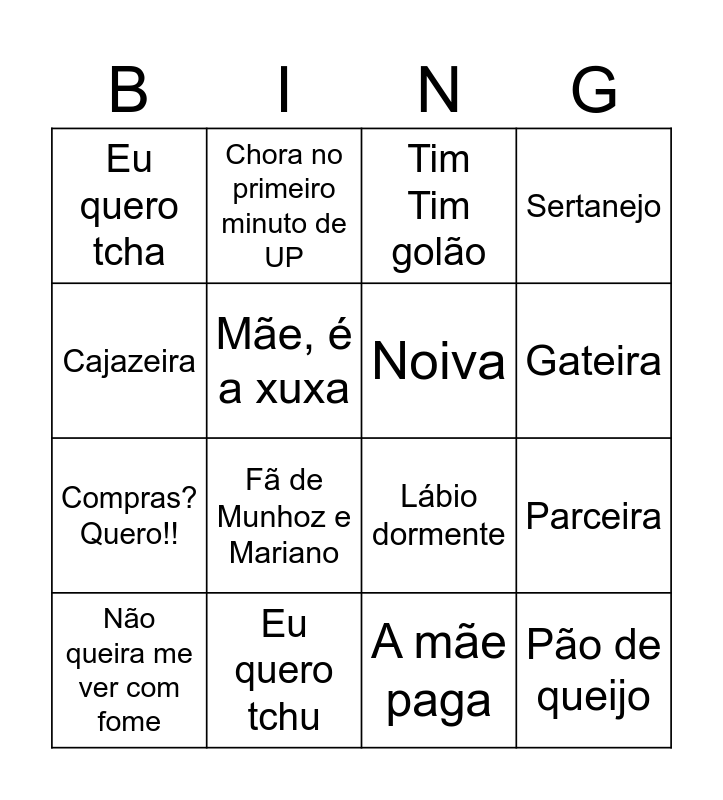This bingo card has 20 words: Parceira, Furgulho, Tim Tim golão, Cagaram em mim, Não queira me ver com fome, Cajazeira, Eu quero tchu, Eu quero tcha, Compras? Quero!!, Chora no primeiro minuto de UP, Fã de Munhoz e Mariano, Lábio dormente, Mãe, é a xuxa, Pão de queijo, Noiva, Aqui jaz uma solteira, Gateira, Sertanejo, A mãe paga and Game over Maia.