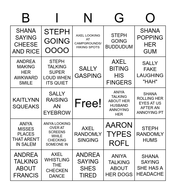 This bingo card has a free space and 24 words: ANIYA LOOKING OVER AT SCREENS WHILE CHECKING SOMEONE IN, AXEL WHISTLING THE CHECKEN DANCE, SALLY GASPING, ANDREA TALKING ABOUT FRANCIS, SHANA POPPING HER GUM, SHANA SAYING CHEESE AND RICE, ANDREA MAKING HER AWKWARD SMILE, STEPH GOING OOOO, ANIYA TALKING ABOUT HER HUSBAND ANNOYING HER, AXEL RANDOMLY SINGING, AXEL BITING HIS FINGERS, KAITLYNN SQUEAKS, AARON TYPES ROFL, STEPH RANDOMLY HUMS, STEPH TALKING SUPER LOUD WHEN ITS QUIET, ANIYA TALKING ABOUT HER DOGS, SHANA ROLLING HER EYES AT US AFTER AN ANNOYING PT, AXEL LOOKING AT CAMPGROUNDS/ HIKING SPOTS, SALLY FAKE LAUGHING "HAH", SALLY RAISING AN EYEBROW, SHANA SAYING SHE HAS A HEADACHE, ANIYA MISSES PLACES THAT AREN'T IN SALEM, STEPH GOING BUDDUDUM and ANDREA SAYING SHES TIRED.