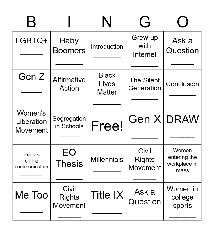 This bingo card has a free space and 24 words: EO Thesis _____, Civil Rights Movement ______, Black Lives Matter _______, Me Too ____, Ask a Question _____, LGBTQ+ _____, Gen Z ____, Baby Boomers ______, Gen X ____, Millennials _______, The Silent Generation _______, Women's Liberation Movement _____, Civil Rights Movement ______, Women entering the workplace in mass _________, Affirmative Action _______, Ask a Question ______, DRAW ____, Introduction ________, Conclusion _______, Segregation in Schools ______, Women in college sports _______, Prefers online communication ________, Grew up with Internet _______ and Title IX _____.