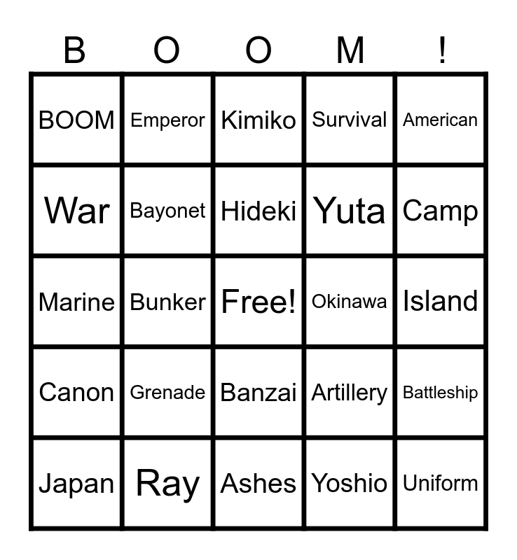 This bingo card has a free space and 24 words: Grenade, Ray, Hideki, Japan, American, BOOM, War, Emperor, Okinawa, Banzai, Yuta, Marine, Artillery, Battleship, Bayonet, Yoshio, Island, Kimiko, Camp, Bunker, Uniform, Canon, Survival and Ashes.
