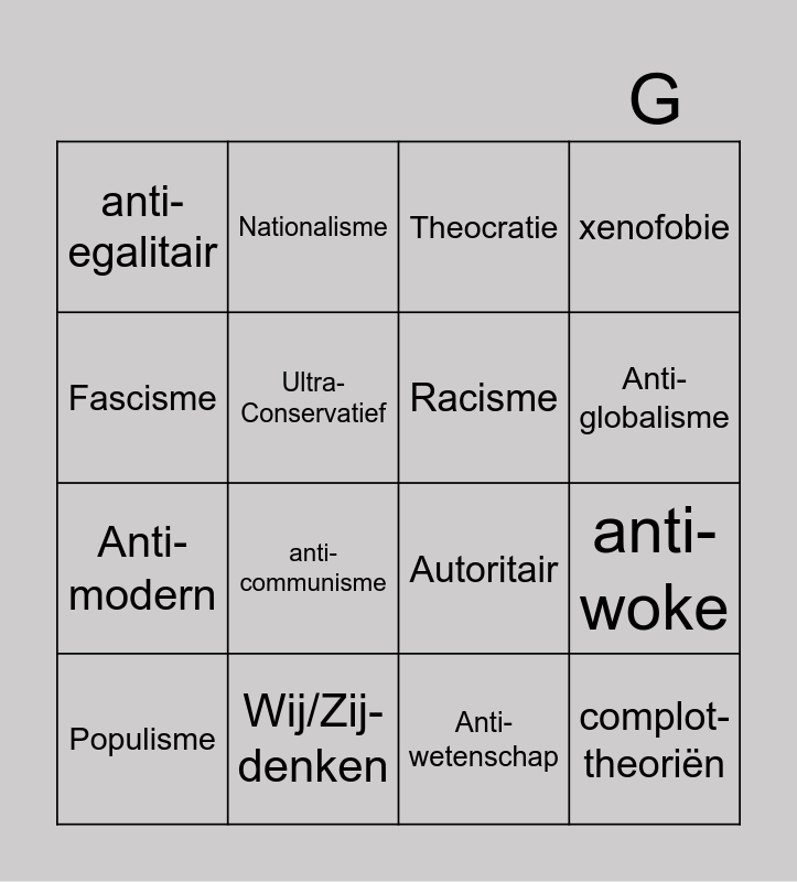 This bingo card has 16 words: Wij/Zij-denken, anti-woke, Theocratie, anti-egalitair, Anti-modern, Nationalisme, Autoritair, Anti-wetenschap, Fascisme, Ultra-Conservatief, Populisme, xenofobie, anti-communisme, Anti-globalisme, Racisme and complot-theoriën.