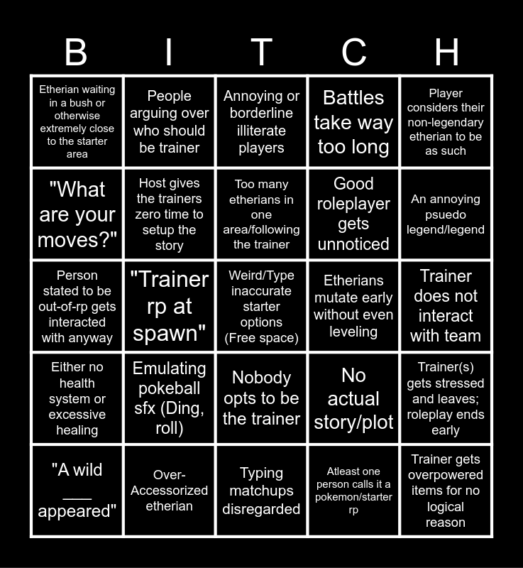 This bingo card has a free space and 51 words: Roleplay is swapped or restarted after failing, Trainer gets overpowered items for no logical reason, Improper team count (>6), Typing matchups disregarded, Emulating pokeball sfx (Ding, roll), Trainer vs Rival fight, People arguing over who should be trainer, Inaccurate to pokemon and MoE's game rules, "What are your moves?", Atleast one godmodder, Host gives the trainers zero time to setup the story, Battles take way too long, Trainer(s) gets stressed and leaves; roleplay ends early, No actual story/plot, "Stand up here if you're a starter", Custom item names (Usually for pokeballs), Too many etherians in one area/following the trainer, Etherians mutate early without even leveling, Main trainer constantly overpowers rival (or vice versa), Player considers their non-legendary etherian to be as such, "Trainer rp at spawn", Atleast one person calls it a pokemon/starter rp, Etherian waiting in a bush or otherwise extremely close to the starter area, Good roleplayer gets unnoticed, Trainer or rival roleplaying dramatically (Like ash ketchum), "Can I join", An annoying psuedo legend/legend, No overarching goal for rival or trainer (becoming champion, beating gyms, etc.), "A wild ___ appeared", Annoying or borderline illiterate players, Etherians speaking like pokemon, Unpicked starters become wild, Etherian begs for a trainer, Fails before it even starts, "I'll be at ____", Over-Accessorized etherian, Trainer spams one move, Half of the map goes unused, Trainer and rival run around randomly, moron host, Trainer does not interact with team, Either no health system or excessive healing, "Not it", Etherians appearing in nonsensical locations (e.g. water type in volcano), Extremely boring, Failed roleplay, Person stated to be out-of-rp gets interacted with anyway, Host is ignored, Rp ends after first battle, Nobody opts to be the trainer and Horrific spelling.