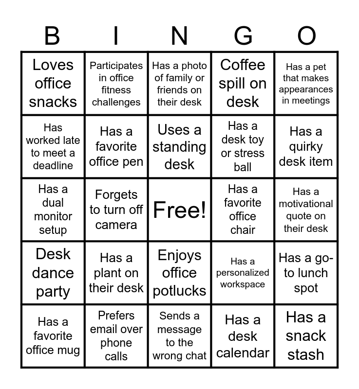 This bingo card has a free space and 24 words: Has a plant on their desk, Prefers email over phone calls, Uses a standing desk, Has a favorite office mug, Has a pet that makes appearances in meetings, Loves office snacks, Has worked late to meet a deadline, Participates in office fitness challenges, Has a favorite office chair, Enjoys office potlucks, Has a desk toy or stress ball, Has a dual monitor setup, Has a personalized workspace, Has a go-to lunch spot, Has a favorite office pen, Has a desk calendar, Has a motivational quote on their desk, Has a photo of family or friends on their desk, Has a quirky desk item, Forgets to turn off camera, Has a snack stash, Desk dance party, Coffee spill on desk and Sends a message to the wrong chat.
