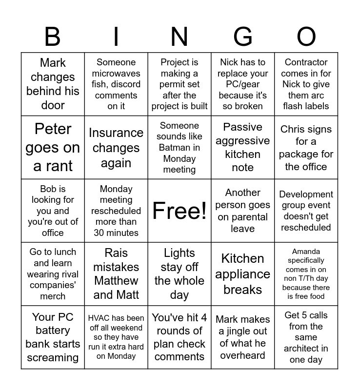 This bingo card has a free space and 28 words: Amanda specifically comes in on non T/Th day because there is free food, Someone in meeting says "Robinson", Passive aggressive kitchen note, Mark makes a jingle out of what he overheard, Peter goes on a rant, Project is making a permit set after the project is built, Someone microwaves fish, discord comments on it, Go to lunch and learn wearing rival companies' merch, Another person goes on parental leave, Your PC battery bank starts screaming, Bob is looking for you and you're out of office, Nick has to replace your PC/gear because it's so broken, HVAC has been off all weekend so they have run it extra hard on Monday, You've hit 4 rounds of plan check comments, Chris signs for a package for the office, There is a dog in the office!, Rais mistakes Matthew and Matt, Insurance changes again, Someone sounds like Batman in Monday meeting, Lights stay off the whole day, Mark changes behind his door, Ly, Mark, Bob are all talking together, Get 5 calls from the same architect in one day, Monday meeting rescheduled more than 30 minutes, Development group event doesn't get rescheduled, Kitchen appliance breaks, Contractor comes in for Nick to give them arc flash labels and You go on a 2+ hour site visit.