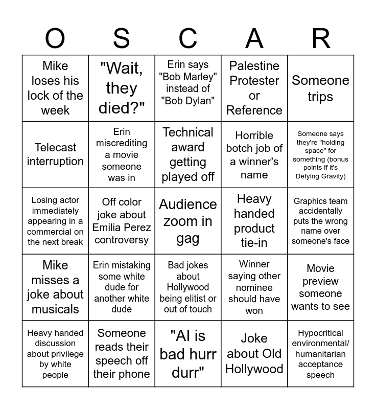 This bingo card has 25 words: Erin mistaking some white dude for another white dude, "AI is bad hurr durr", Technical award getting played off, Heavy handed discussion about privilege by white people, Someone trips, Mike loses his lock of the week, Telecast interruption, "Wait, they died?", Heavy handed product tie-in, Bad jokes about Hollywood being elitist or out of touch, Horrible botch job of a winner's name, Losing actor immediately appearing in a commercial on the next break, Winner saying other nominee should have won, Movie preview someone wants to see, Erin miscrediting a movie someone was in, Hypocritical environmental/ humanitarian acceptance speech, Graphics team accidentally puts the wrong name over someone's face, Erin says "Bob Marley" instead of "Bob Dylan", Someone says they're "holding space" for something (bonus points if it's Defying Gravity), Off color joke about Emilia Perez controversy, Audience zoom in gag, Someone reads their speech off their phone, Mike misses a joke about musicals, Palestine Protester or Reference and Joke about Old Hollywood.
