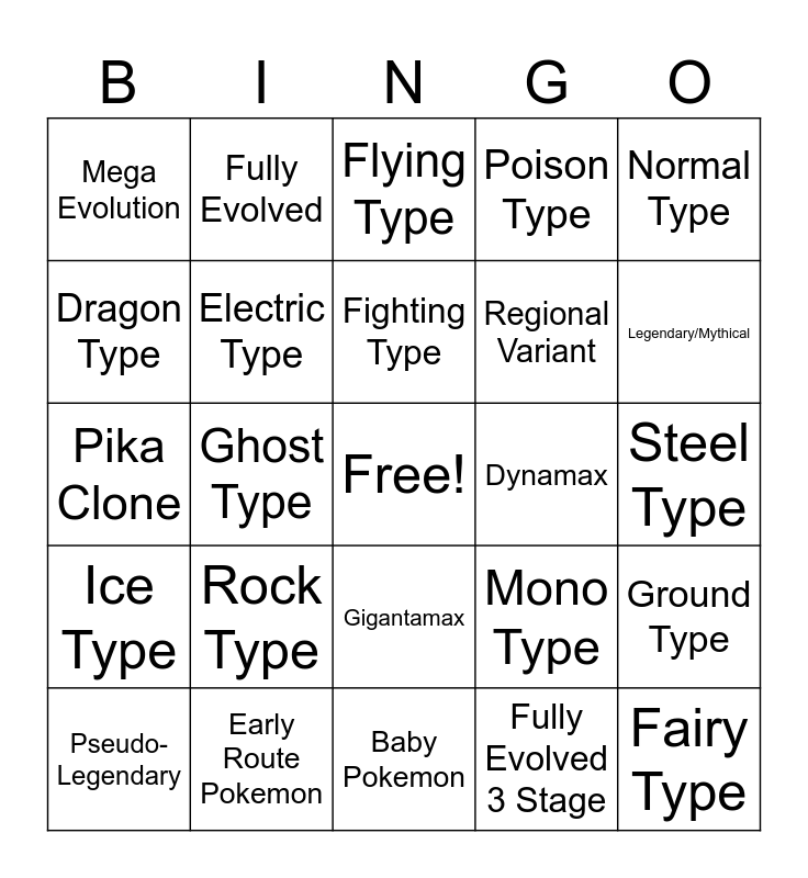 This bingo card has a free space and 37 words: Fire Type, Water Type, Grass Type, Electric Type, Ground Type, Rock Type, Fighting Type, Dark Type, Normal Type, Psychic Type, Ghost Type, Poison Type, Fairy Type, Steel Type, Dragon Type, Ice Type, Bug Type, Flying Type, Gigantamax, Dynamax, Mega Evolution, Legendary/Mythical, Pseudo-Legendary, Baby Pokemon, Middle Stage, Fully Evolved 3 Stage, Fully Evolved, Dog Pokemon, Cat Pokemon, Frog Pokemon, Bird Pokemon, Early Route Pokemon, Pika Clone, Dual Type, Mono Type, Regional Variant and No Evo.