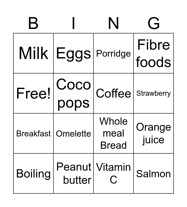This bingo card has 16 words: Peanut butter, Orange juice, Porridge, Milk, Breakfast, Eggs, Whole meal Bread, Vitamin C, Free!, Coco pops, Boiling, Fibre foods, Omelette, Strawberry, Coffee and Salmon.