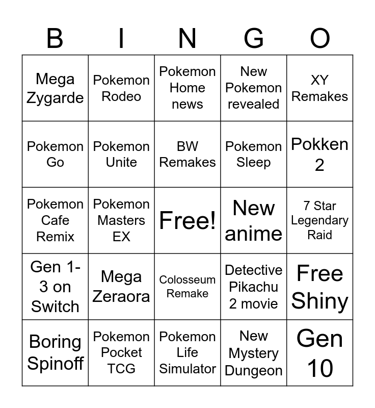 This bingo card has a free space and 24 words: Mega Zeraora, Pokemon Pocket TCG, BW Remakes, Boring Spinoff, XY Remakes, Mega Zygarde, Pokemon Go, Pokemon Rodeo, New anime, Colosseum Remake, Pokemon Sleep, Pokemon Cafe Remix, Detective Pikachu 2 movie, Free Shiny, Pokemon Unite, New Mystery Dungeon, 7 Star Legendary Raid, Pokemon Home news, Pokken 2, Pokemon Masters EX, Gen 10, Gen 1-3 on Switch, New Pokemon revealed and Pokemon Life Simulator.