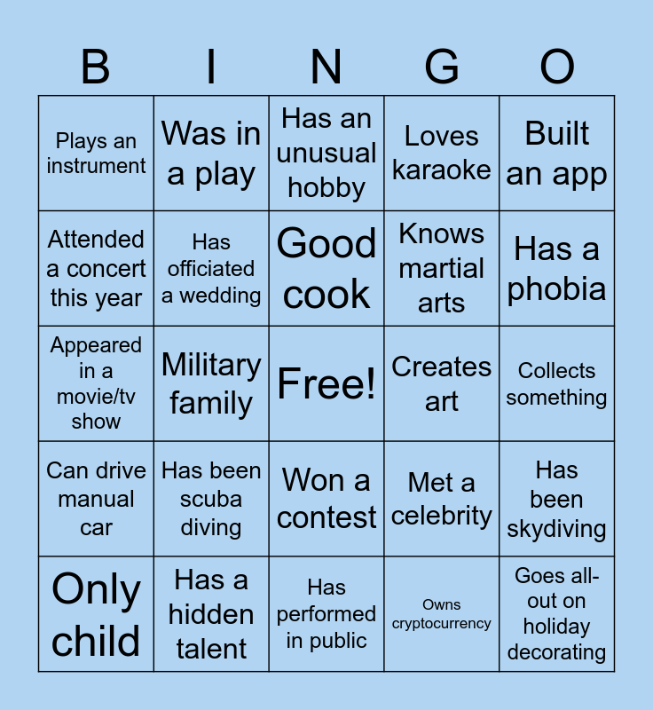 This bingo card has a free space and 29 words: Only child, Comes from a big immediate family - 4 or more, Military family, Lived in a country other than current one, Plays an instrument, Has an unusual hobby, Has officiated a wedding, Has been scuba diving, Creates art, Has a hidden talent, Collects something, Goes all-out on holiday decorating, Has performed in public, Owns cryptocurrency, Has a phobia, Speaks 3+ languages, Won a contest, Can drive manual car, Built an app, Appeared in a movie/tv show, Met a celebrity, Has an unusual family tradition, Knows martial arts, Attended a concert this year, Loves karaoke, Was in a play, Has been skydiving, Good cook and Has broken a bone.