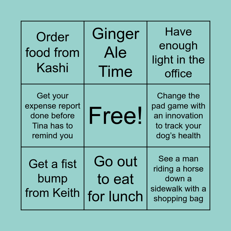 This bingo card has a free space and 8 words: Change the pad game with an innovation to track your dog’s health, Have enough light in the office, Ginger Ale Time, Get a fist bump from Keith, Order food from Kashi, See a man riding a horse down a sidewalk with a shopping bag, Get your expense report done before Tina has to remind you and Go out to eat for lunch.