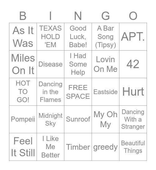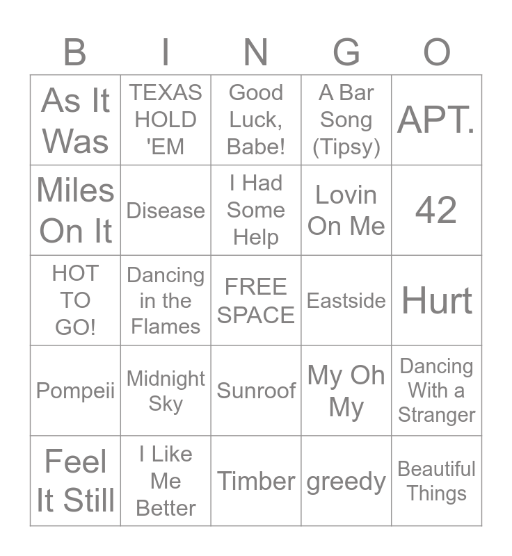 This bingo card has a free space and 75 words: Too Sweet, Abracadabra, Good Luck, Babe!, BIRDS OF A FEATHER, Sports Car, Taste, Bad Dreams, Stargazing, Slow It Down, Close To You, clouds, Diet Pepsi, I Had Some Help, Miles On It, 360, Dancing in the Flames, Nice to Meet You, Beautiful Things, Die With a Smile, APT., Stick Season, HOT TO GO!, Disease, TEXAS HOLD 'EM, A Bar Song (Tipsy), Houdini, Love Somebody, Home, MILLION DOLLAR BABY, I Like It, I Don't Wanna Wait, Criminals, Sugar, My Oh My, 42, Lovin On Me, Good News, Sink Or Swim, Hurt, greedy, Fortnight, Wild Ones, Cruel Summer, LIFETIMES, Better Days, Lil Boo Thang, Feel It Still, As It Was, Sunflower, Leave Before You Love Me, Bad at Love, Sunroof, I Like You (A Happier Song), Die For You, Beautiful Mistakes, Austin, Heat Waves, Unstoppable, Intentions, Left and Right, Midnight Sky, Love You Like a Love Song, Only Girl (In the World), Let Me Love You, My House, Eastside, Classic, Youngblood, Jealous, Dancing With a Stranger, Pompeii, I Like Me Better, There's Nothing Holdin' Me Back, Timber and Lights.