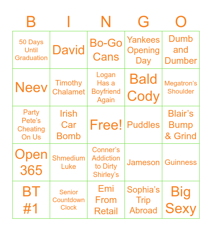 This bingo card has a free space and 78 words: Devil Bowls, 2$ Drafts, Bo-Go Cans, Guess The Song, St.Practice Day, St.Baldricks, Karaoke, Stealing Signs, St.Patrick’s Day, Bo-Go Pitchers, Jug -R- Not Buckets, Friday Happy Hour, Yankees Opening Day, 50 Days Until Graduation, Perm, Neev, El Peeperino, Shmedium Luke, The Plow, Blair’s Bump & Grind, Logan Doesn’t Know How To Swim, Dumb and Dumber, Party Pete’s Cheating On Us, Logan Has a Boyfriend Again, Timothy Chalamet, Teddy Buns, Naomi’s in Italy, Lili’s Long Fingers, Ms.Teacher Lady, OSHA’s Vicious Rumors, Megatron’s Shoulder, Bills Mafia Sarah, Emi From Retail, Shakira, BT #1, Puddles, Pats Puppy, Tarzan Gets a Haircut, Mike Peter’s Tazer Kink, Big Sexy, Bubba, Joey’s in Prison, Maxipad, Cullens Golden Vocal Chords, Luke & Jason Change a Light Bulb, David, Sean, Sour Patch Shot, Green Tea Shot, White Tea Shot, Guinness, Irish Car Bomb, Jameson, Bender, New Girl, Jug Bus, Jug Dog, Jake The Snakes Sick Fits, Walter White, Conner’s Addiction to Dirty Shirley’s, Bald Cody, Game Night, Trivia, Carsen’s Sticky Fall, Leprechaun, Green Beer, Paige’s Weird Words, Marissa Mondays, Open 365, Senior Countdown Clock, 31 Club, Mug Club, Random Shot Jar, Tyler & Cullens Wacky Wednesdays, Sophia’s Trip Abroad, Blaster Jack, Swim Team (Champions) and Walter White.
