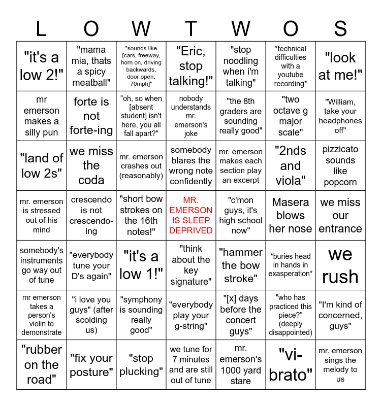 This bingo card has a free space and 48 words: "[x] days before the concert guys", "two octave g major scale", we tune for 7 minutes and are still out of tune, crescendo is not crescendo-ing, mr. emerson crashes out (reasonably), we miss our entrance, "mama mia, thats a spicy meatball", "fix your posture", *technical difficulties with a youtube recording*, "think about the key signature", "look at me!", "Eric, stop talking!", "2nds and viola", mr. emerson makes each section play an excerpt, mr emerson takes a person's violin to demonstrate, Masera blows her nose, mr emerson makes a silly pun, "William, take your headphones off", "who has practiced this piece?" (deeply disappointed), "stop noodling when i'm talking", "the 8th graders are sounding really good", "short bow strokes on the 16th notes!", "it's a low 2!", forte is not forte-ing, "I'm kind of concerned, guys", "oh, so when [absent student] isn't here, you all fall apart?", pizzicato sounds like popcorn, "rubber on the road", somebody blares the wrong note confidently, we miss the coda, "vi-brato", "c'mon guys, it's high school now", we rush, "i love you guys" (after scolding us), mr. emerson is stressed out of his mind, "hammer the bow stroke", *buries head in hands in exasperation*, "land of low 2s", "it's a low 1!", "symphony is sounding really good", somebody's instruments go way out of tune, mr. emerson sings the melody to us, "sounds like [cars, freeway, horn on, driving backwards, door open, 70mph]", "stop plucking", nobody understands mr. emerson's joke, "everybody play your g-string", "everybody tune your D's again" and mr. emerson's 1000 yard stare.