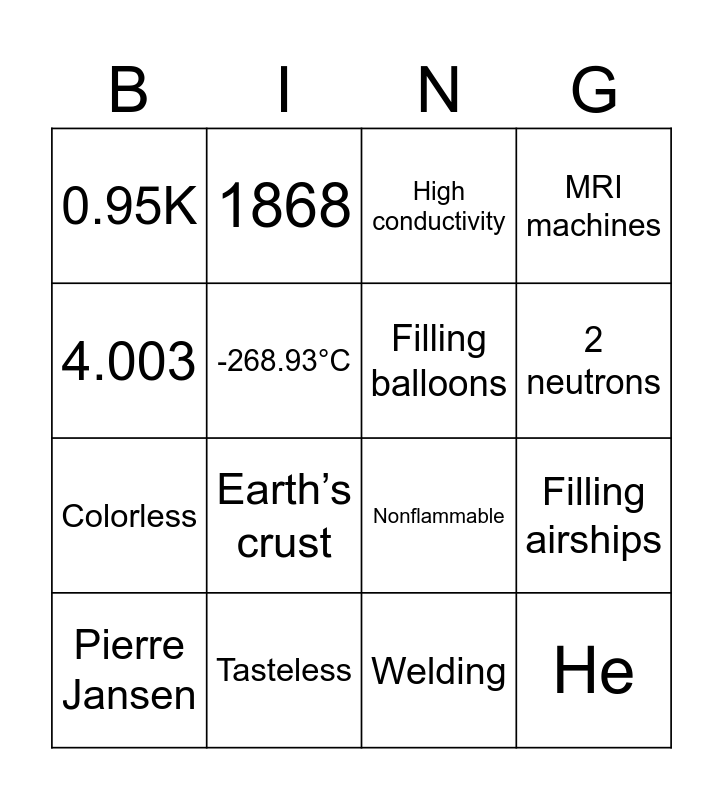 This bingo card has 23 words: He, 2 protons, 2 neutrons, 2 electrons, 4.003, 0.95K, -268.93°C, 1868, Pierre Jansen, Atmosphere, Earth’s crust, Colorless, Odorless, Low density, Tasteless, Gas, High conductivity, Nonflammable, Filling balloons, Filling airships, MRI machines, Welding and Heliox.