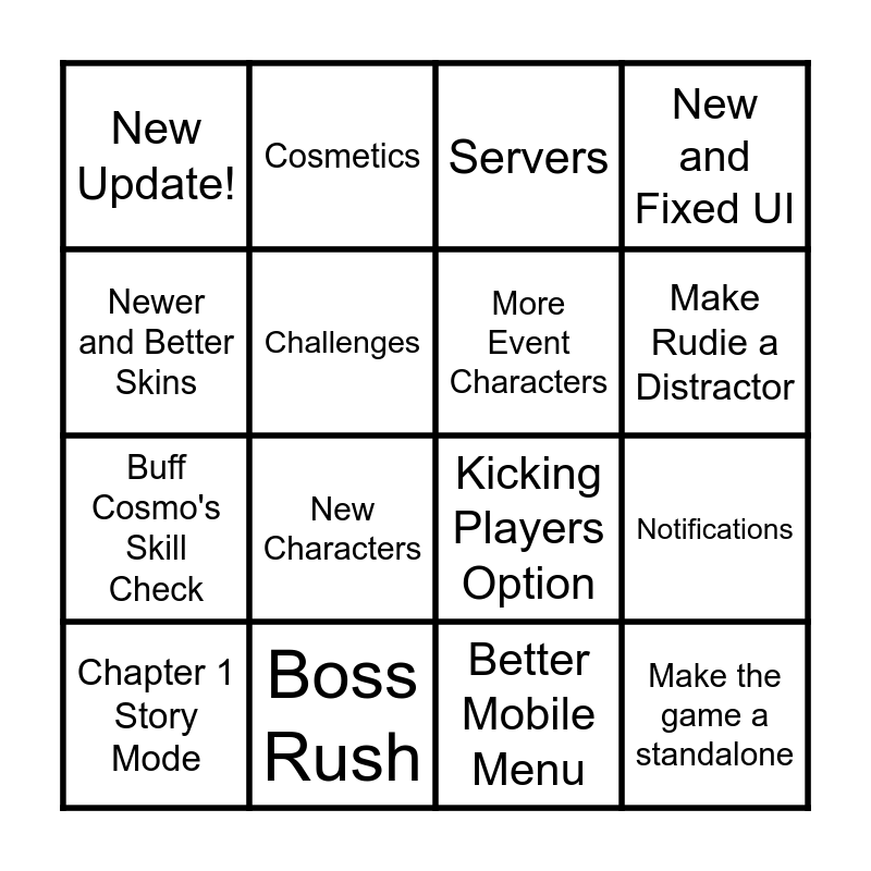 This bingo card has 16 words: Chapter 1 Story Mode, Boss Rush, Servers, New and Fixed UI, Newer and Better Skins, Cosmetics, Kicking Players Option, Notifications, New Update!, Challenges, Better Mobile Menu, Make Rudie a Distractor, Buff Cosmo's Skill Check, New Characters, More Event Characters and Make the game a standalone.