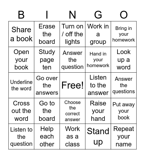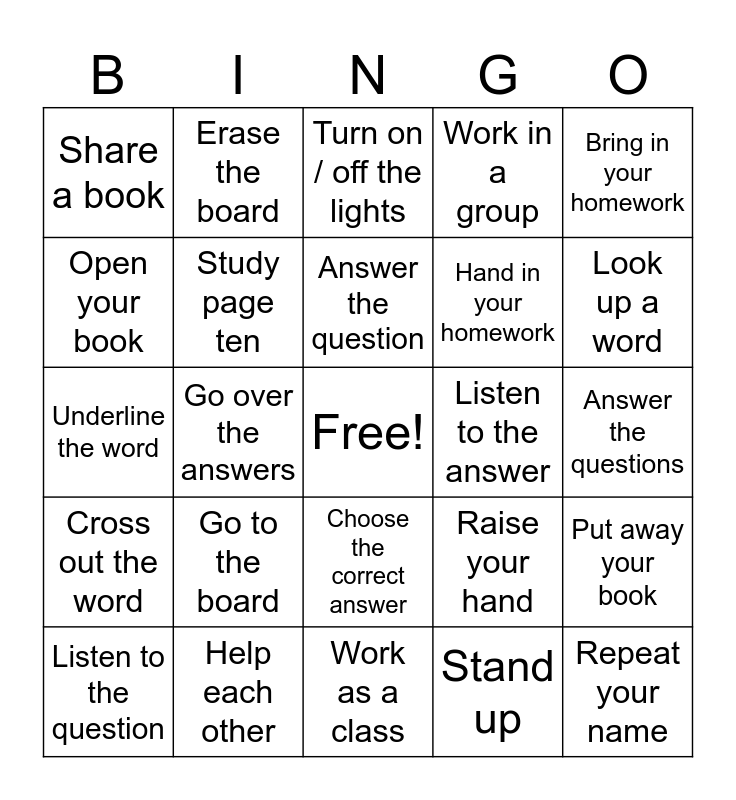 This bingo card has a free space and 53 words: Say your name, Repeat your name, Spell your name, Stand up, Go to the board, Write on the board, Erase the board, Sit down / Take your seat, Open your book, Read page ten, Study page ten, Close / open your book, Put away your book, Raise your hand, Ask a question, Listen to the question, Answer the question, Listen to the answer, Do your homework, Bring in your homework, Go over the answers, Correct your mistakes, Hand in your homework, Share a book, Discuss the question, Help each other, Work together, Share with the class, Look in the dictionary, Look up a word, Pronounce the word, Read the definition, Copy the word, Work alone / Do your own work, Work with a partner, Break up into small groups, Work in a group, Work as a class, Turn on / off the lights, Take notes, Take out a piece of paper, Pass out the tests, Answer the questions, Check your answers, Collect the tests, Choose the correct answer, Circle the correct answer, Fill in the blank, Underline the word, Cross out the word, Unscramble the word, Put the words in order and Write on a separate sheet of paper.