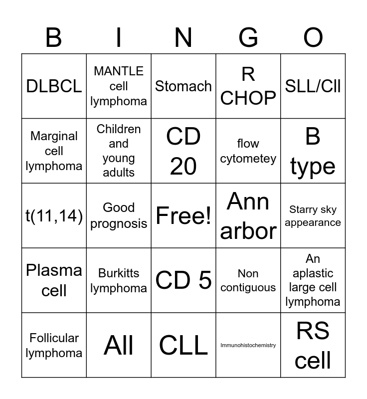 This bingo card has a free space and 24 words: Follicular lymphoma, Burkitts lymphoma, CD 20, Immunohistochemistry, SLL/Cll, DLBCL, MANTLE cell lymphoma, Stomach, Ann arbor, Starry sky appearance, t(11,14), Children and young adults, Non contiguous, An aplastic large cell lymphoma, Marginal cell lymphoma, All, CLL, R CHOP, B type, Plasma cell, Good prognosis, CD 5, flow cytometey and RS cell.