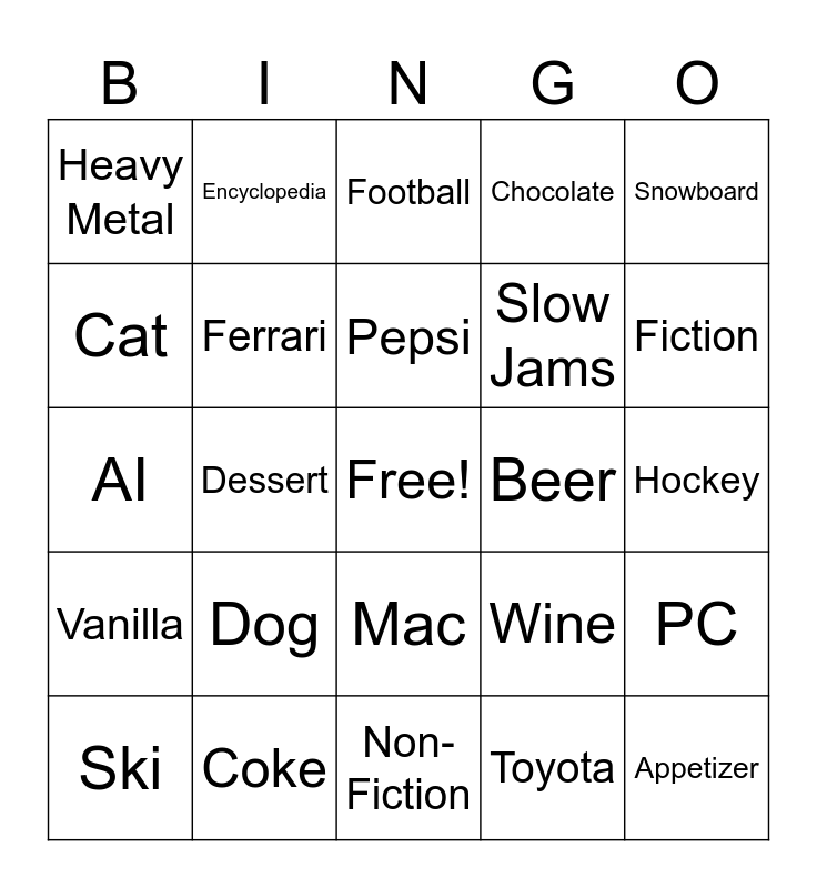 This bingo card has a free space and 24 words: Dog, Coke, Pepsi, Ski, Snowboard, Heavy Metal, Cat, Encyclopedia, Beer, Mac, Slow Jams, AI, Wine, PC, Ferrari, Toyota, Hockey, Football, Fiction, Dessert, Appetizer, Vanilla, Chocolate and Non-Fiction.