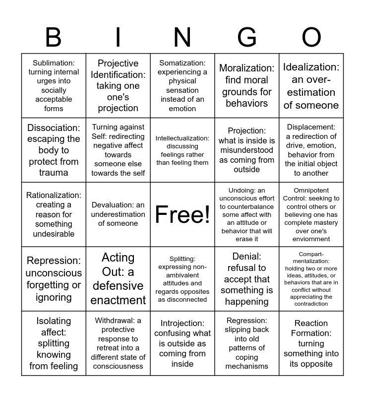 This bingo card has a free space and 24 words: Acting Out: a defensive enactment, Withdrawal: a protective response to retreat into a different state of consciousness, Intellectualization: discussing feelings rather than feeling them, Isolating affect: splitting knowing from feeling, Idealization: an over- estimation of someone, Sublimation: turning internal urges into socially acceptable forms, Dissociation: escaping the body to protect from trauma, Projective Identification: taking one one's projection, Undoing: an unconscious effort to counterbalance some affect with an attitude or behavior that will erase it, Splitting: expressing non-ambivalent attitudes and regards opposites as disconnected, Projection: what is inside is misunderstood as coming from outside, Rationalization: creating a reason for something undesirable, Denial: refusal to accept that something is happening, Compart-mentalization: holding two or more ideas, attitudes, or behaviors that are in conflict without appreciating the contradiction, Turning against Self: redirecting negative affect towards someone else towards the self, Regression: slipping back into old patterns of coping mechanisms, Omnipotent Control: seeking to control others or believing one has complete mastery over one's enviornment, Somatization: experiencing a physical sensation instead of an emotion, Displacement: a redirection of drive, emotion, behavior from the initial object to another, Devaluation: an underestimation of someone, Reaction Formation: turning something into its opposite, Repression: unconscious forgetting or ignoring, Moralization: find moral grounds for behaviors and Introjection: confusing what is outside as coming from inside.