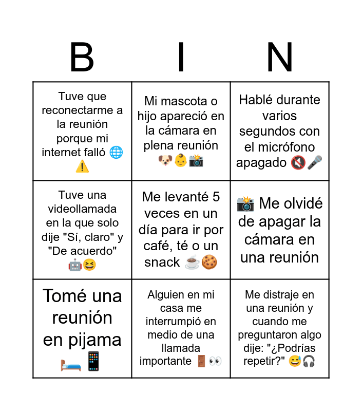 This bingo card has 9 words: Tomé una reunión en pijama 🛏️📱, Hablé durante varios segundos con el micrófono apagado 🔇🎤, Mi mascota o hijo apareció en la cámara en plena reunión 🐶👶📸, Tuve una videollamada en la que solo dije "Sí, claro" y "De acuerdo" 🤖😆, Tuve que reconectarme a la reunión porque mi internet falló 🌐⚠️, 📸 Me olvidé de apagar la cámara en una reunión, Me levanté 5 veces en un día para ir por café, té o un snack ☕🍪, Me distraje en una reunión y cuando me preguntaron algo dije: "¿Podrías repetir?" 😅🎧 and Alguien en mi casa me interrumpió en medio de una llamada importante 🚪👀.