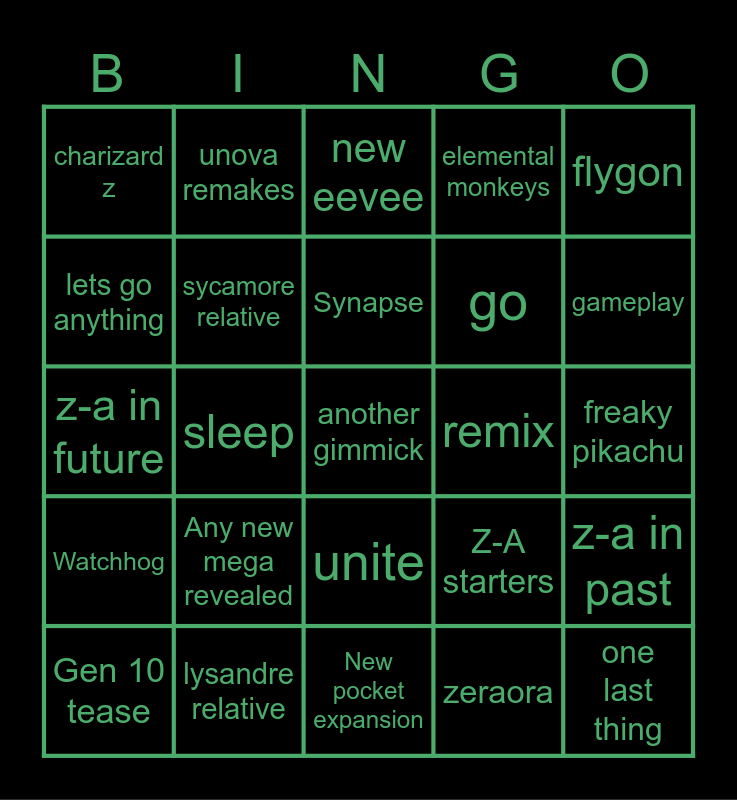 This bingo card has 25 words: Any new mega revealed, New pocket expansion, Synapse, Gen 10 tease, flygon, charizard z, lets go anything, unova remakes, remix, unite, go, z-a in future, Z-A starters, z-a in past, sycamore relative, one last thing, freaky pikachu, new eevee, gameplay, sleep, another gimmick, lysandre relative, Watchhog, elemental monkeys and zeraora.