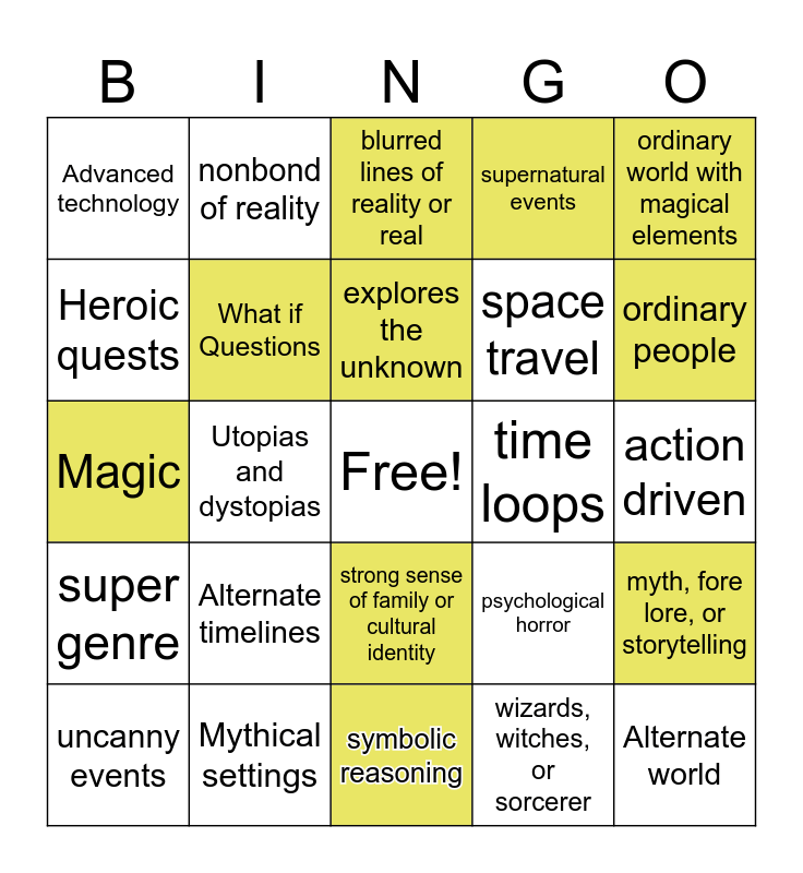 This bingo card has a free space and 24 words: Alternate timelines, Mythical settings, explores the unknown, uncanny events, ordinary world with magical elements, Advanced technology, Heroic quests, nonbond of reality, time loops, strong sense of family or cultural identity, space travel, Magic, psychological horror, myth, fore lore, or storytelling, What if Questions, wizards, witches, or sorcerer, action driven, blurred lines of reality or real, ordinary people, Utopias and dystopias, Alternate world, super genre, supernatural events and symbolic reasoning.