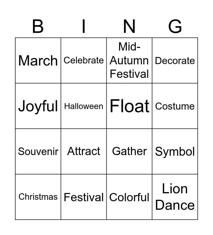 This bingo card has 16 words: Christmas, Festival, Mid-Autumn Festival, Decorate, Joyful, Celebrate, Gather, Symbol, March, Halloween, Colorful, Costume, Souvenir, Attract, Float and Lion Dance.