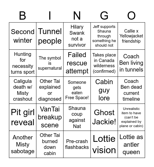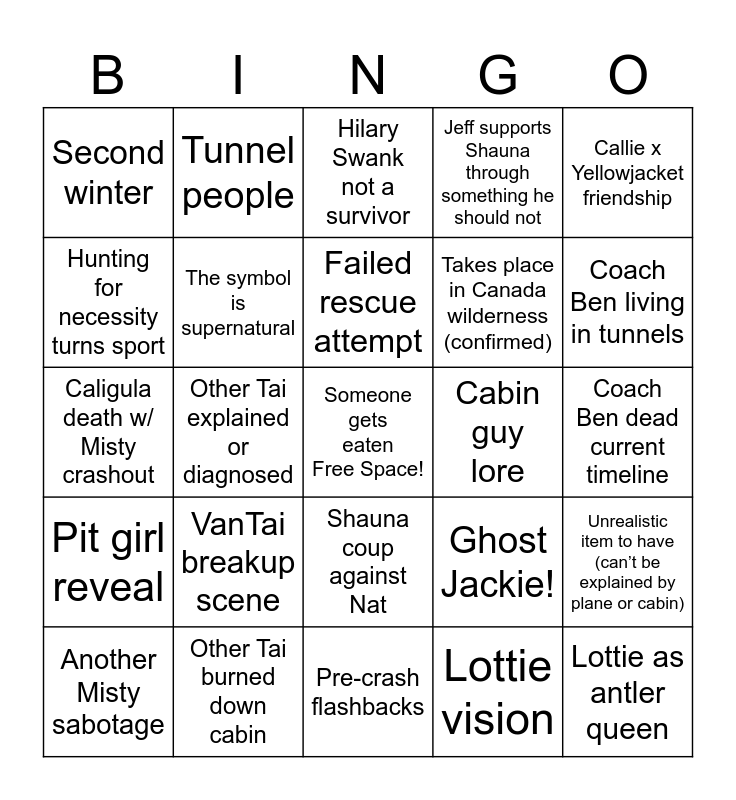 This bingo card has a free space and 24 words: VanTai breakup scene, Other Tai burned down cabin, Failed rescue attempt, Another Misty sabotage, Callie x Yellowjacket friendship, Second winter, Hunting for necessity turns sport, Tunnel people, Cabin guy lore, Shauna coup against Nat, Takes place in Canada wilderness (confirmed), Caligula death w/ Misty crashout, Ghost Jackie!, Unrealistic item to have (can’t be explained by plane or cabin), The symbol is supernatural, Lottie vision, Coach Ben dead current timeline, Hilary Swank not a survivor, Coach Ben living in tunnels, Other Tai explained or diagnosed, Lottie as antler queen, Pit girl reveal, Jeff supports Shauna through something he should not and Pre-crash flashbacks.