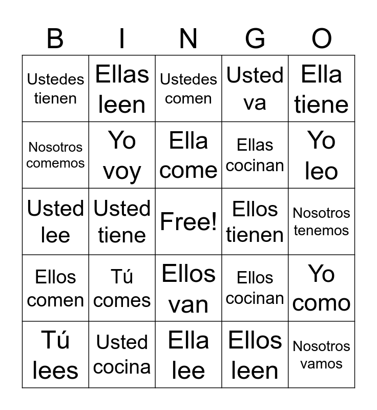 This bingo card has a free space and 37 words: Yo tengo, Tú tienes, Tú vas, Yo voy, Yo como, Tú comes, Ella come, Ella va, Ella tiene, Usted tiene, Usted tiene, Usted va, Nosotros vamos, Nosotros tenemos, Nosotros comemos, Ellos comen, Ellas comen, Ustedes comen, Ellos van, Ellos tienen, Ustedes tienen, Yo leo, Tú lees, Ella lee, Nosotros leemos, Ellos leen, Ellas leen, Ustedes leen, Yo cocino, Tú cocinas, Ella cocina, Usted cocina, Usted lee, Nosotros cocinamos, Ellos cocinan, Ellas cocinan and Ustedes cocinan.