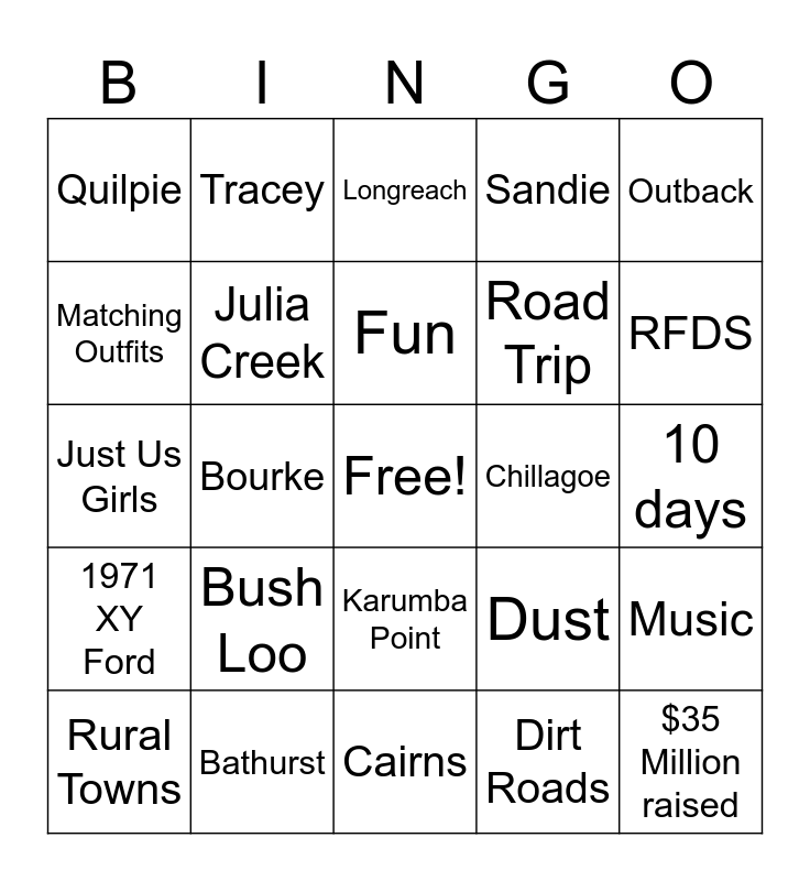 This bingo card has a free space and 30 words: Bathurst, Dubbo, Bourke, Cunnamulla, Quilpie, Longreach, Julia Creek, Karumba Point, Chillagoe, Cairns, 10 days, $35 Million raised, Dirt Roads, Creek Crossings, RFDS, Camping, Dust, 1971 XY Ford, Bush Loo, Outback, Just Us Girls, Louise, Tracey, Road Trip, Matching Outfits, Sandie, Music, Rural Towns, Fun and Mickey.