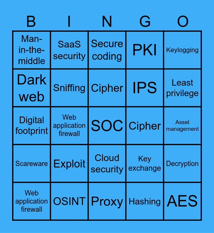This bingo card has 187 words: Free!, Adware, AES, APT, Antivirus, Authentication, Backup, Blacklist, Botnet, Brute force, Buffer overflow, C2 server, CAPTCHA, Certificate, Cipher, Clickjacking, Cloud security, Cross-site scripting (XSS), CSRF, Cryptography, Cyberattack, Cybercrime, Data breach, DDoS, Decryption, Digital forensics, DMZ, DNS poisoning, Domain hijacking, EDR, Encryption, Endpoint security, Exploit, Firewall, Forensic analysis, Hashing, Heuristic analysis, Honeypot, IAM, IDS, Incident response, Insider threat, IoC, IPS, ISO 27001, Keylogging, LDAP, Malvertising, Malware, Man-in-the-middle, MFA, NIDS, Nmap, OSINT, Patching, Penetration testing, Phishing, PKI, Privilege escalation, Proxy, Ransomware, Red team, Reverse engineering, Risk assessment, Rootkit, SaaS security, Sandboxing, Scareware, SIEM, Smishing, Sniffing, Social engineering, SOC, Spoofing, Spyware, SQL injection, Steganography, Supply chain attack, Threat hunting, Threat intelligence, Tokenization, Trojan, TTPs, Two-factor authentication, UAC, URL filtering, VPN, Vishing, Vulnerability, Watering hole attack, Web application firewall, Whaling, White hat, Worm, Zero-day, Zombie, Cyber hygiene, Asset management, Least privilege, Dark web, Secure coding, Key exchange, Cloud computing security, Digital footprint, Quantum cryptography, Security awareness, Threat modeling, Zero trust, Adware, AES, APT, Antivirus, Authentication, Backup, Blacklist, Botnet, Brute force, Buffer overflow, C2 server, Certificate, Cipher, Clickjacking, Cloud security, Cryptography, Cyberattack, Cybercrime, Data breach, DDoS, Decryption, Digital forensics, Domain hijacking, EDR, Encryption, Endpoint security, Exploit, Firewall, Hashing, Honeypot, IAM, IDS, Incident response, Insider threat, IPS, ISO 27001, Malvertising, Malware, Man-in-the-middle, MFA, OSINT, Penetration testing, Phishing, Privilege escalation, Proxy, Ransomware, Reverse engineering, Risk assessment, SIEM, Smishing, Sniffing, Social engineering, SOC, Spoofing, Spyware, SQL injection, Supply chain attack, Threat hunting, Threat intelligence, Tokenization, Trojan, UAC, VPN, Vulnerability, Web application firewall, White hat, Worm, Zero-day, Zombie, Cyber hygiene, Asset management, Least privilege, Dark web, Secure coding, Key exchange, Digital footprint, Security awareness, Threat modeling and Zero trust.