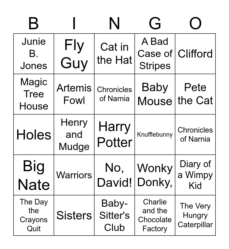 This bingo card has 32 words: Charlie and the Chocolate Factory, Dog Man, Henry and Mudge, Bud Not Buddy, Big Nate, Artemis Fowl, Clifford, Diary of a Wimpy Kid, Fly Guy, The Very Hungry Caterpillar, Chronicles of Narnia, Cat in the Hat, Green Eggs and Ham, Goosebumps, Knufflebunny, Last Kids on Earth, The Day the Crayons Quit, Holes, No, David!, Warriors, Wonky Donky,, Where the Wild Things Are, Chronicles of Narnia, Sisters, Harry Potter, A Bad Case of Stripes, Baby Mouse, Magic Tree House, Junie B. Jones, Baby-Sitter's Club, Biscuit and Pete the Cat.