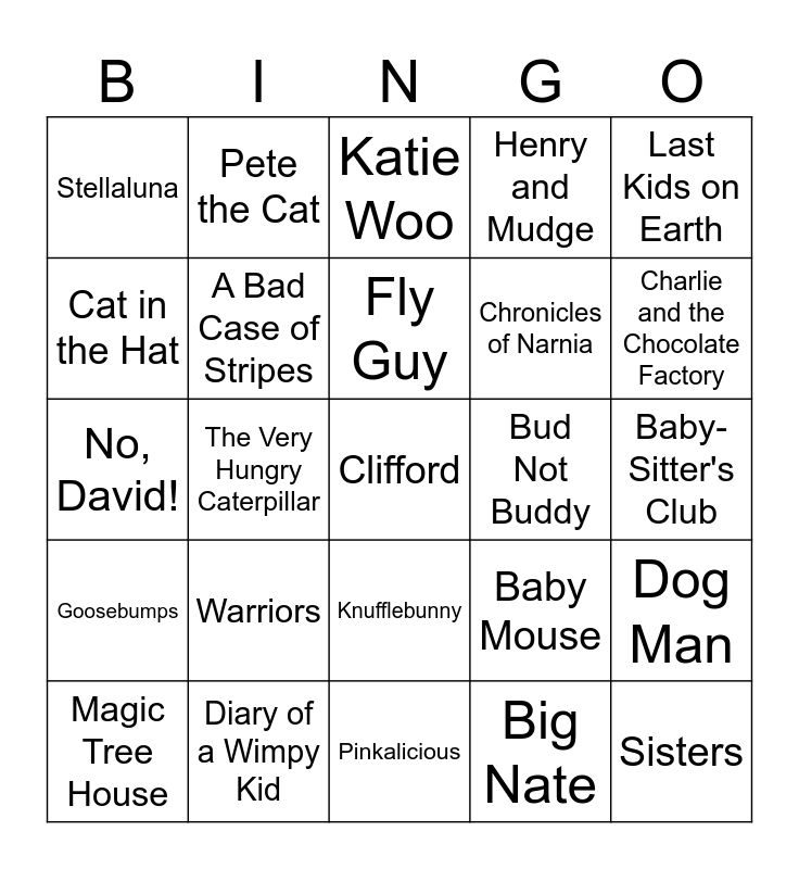 This bingo card has 31 words: Pinkalicious, Where the Wild Things Are, The Very Hungry Caterpillar, Artemis Fowl, Stellaluna, Katie Woo, A Bad Case of Stripes, Baby Mouse, Bud Not Buddy, Big Nate, Baby-Sitter's Club, Clifford, Sisters, The Three Little Pigs, Charlie and the Chocolate Factory, Biscuit, Dog Man, Warriors, Goosebumps, Knufflebunny, Last Kids on Earth, The Day the Crayons Quit, Magic Tree House, Pete the Cat, Chronicles of Narnia, Cat in the Hat, Henry and Mudge, No, David!, Diary of a Wimpy Kid, Fly Guy and Wonky Donky.