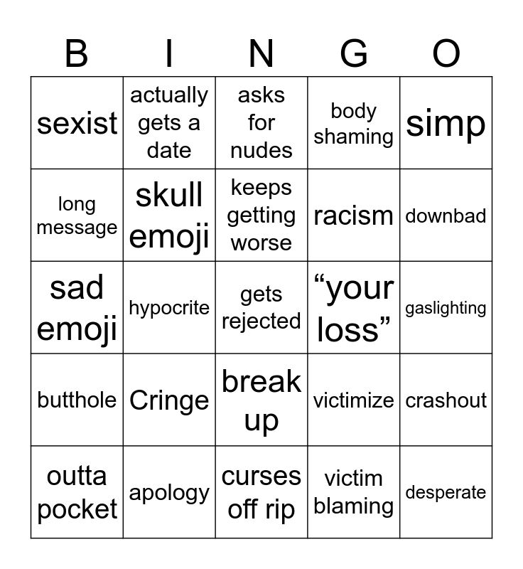 This bingo card has a free space and 24 words: Cringe, apology, keeps getting worse, outta pocket, simp, sexist, long message, actually gets a date, “your loss”, break up, racism, sad emoji, victimize, crashout, skull emoji, victim blaming, gaslighting, asks for nudes, downbad, hypocrite, desperate, butthole, body shaming and curses off rip.