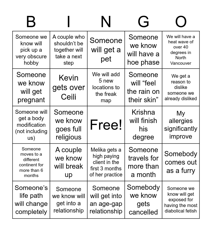 This bingo card has a free space and 24 words: A couple we know will break up, Someone we know will get into a relationship, We will add 5 new locations to the freak map, Someone’s life path will change completely, We will have a heat wave of over 40 degrees in North Vancouver, Someone we know will pick up a very obscure hobby, Someone we know will get pregnant, A couple who shouldn’t be together will take a next step, Krishna will finish his degree, Melika gets a high paying client in the first 3 months of her practice, Someone will “feel the rain on their skin”, Someone will get a body modification (not including us), Someone travels for more than a month, Somebody comes out as a furry, Kevin gets over Ceili, Somebody we know gets cancelled, My allergies significantly improve, Someone will get a pet, We get a reason to dislike someone we already disliked, Someone we know goes full religious, Someone we know will get exposed for having the most diabolical fetish, Someone moves to a different continent for more than 6 months, Someone we know will have a hoe phase and Someone will get into an age-gap relationship.