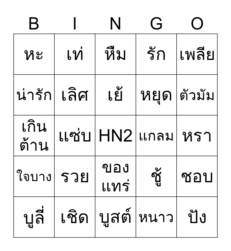 This bingo card has a free space and 50 words: เฮง, ปัง, จึ้ง, บูสต์, รวย, สวย, เท่, หล่อ, น่ารัก, เยี่ยม, เลิศ, รัก, ชอบ, ชู้, สาธุ, กุด, เย้, แกลม, กรรม, เพลีย, แซ่บ, หนาว, หะ, หยุด, ใจฟู, เอ๊ะ, ตัวมัม, ดือ, หืม, ของแทร่, โชคดี, โชคช่วย, ฉ่ำ, แฉะ, เชิด, ฟาด, ตัวตึง, สู่ขิต, ทำถึง, หรา, คุณน้า, โฮ่ง, มงลง, เครซี่, บูลี่, เกินต้าน, ยม, นิพพาน, ใจบาง and เงิน.