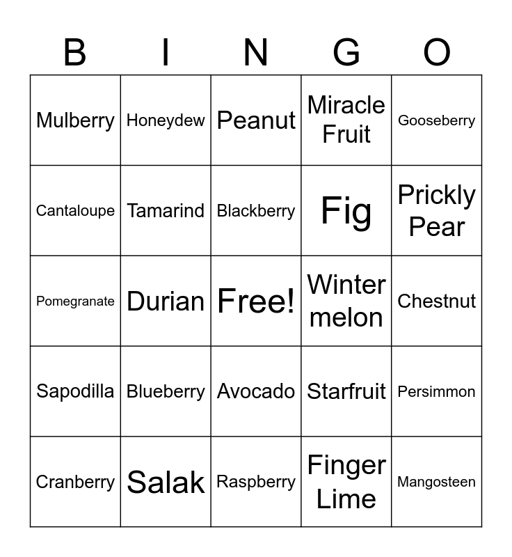 This bingo card has a free space and 25 words: Blueberry, Raspberry, Blackberry, Cranberry, Gooseberry, Mulberry, Cantaloupe, Honeydew, Winter melon, Avocado, Fig, Pomegranate, Starfruit, Persimmon, Tamarind, Coconut, Chestnut, Peanut, Prickly Pear, Durian, Mangosteen, Salak, Sapodilla, Miracle Fruit and Finger Lime.
