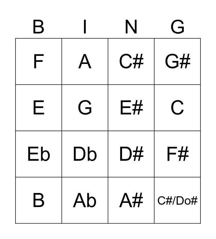 This bingo card has 23 words: C#/Do#, Free!, C, D, E, F, G, A, B, Cb, Db, Eb, Fb, Gb, Ab, Bb, C#, D#, E#, F#, G#, A# and B#.